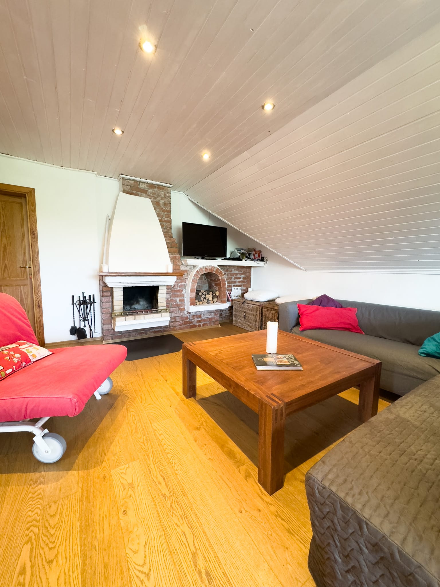 Dominantou prízemia je originálna keramická pec na drevo v kuchyni, ktorá vytvára romantickú atmosféru domova a umožňuje varenie či pečenie tradičným spôsobom. Okrem kuchyne prepojenej s jedálňou sa na prízemí nachádza aj priestranná spálňa, kúpeľňa s WC, vstupná chodba a praktická špajza – všetko prehľadne usporiadané na pohodlné užívanie. Krytá terasa rozširuje obytný priestor do záhrady a poskytuje ideálne miesto na rodinné posedenia s výhľadom do zelene.