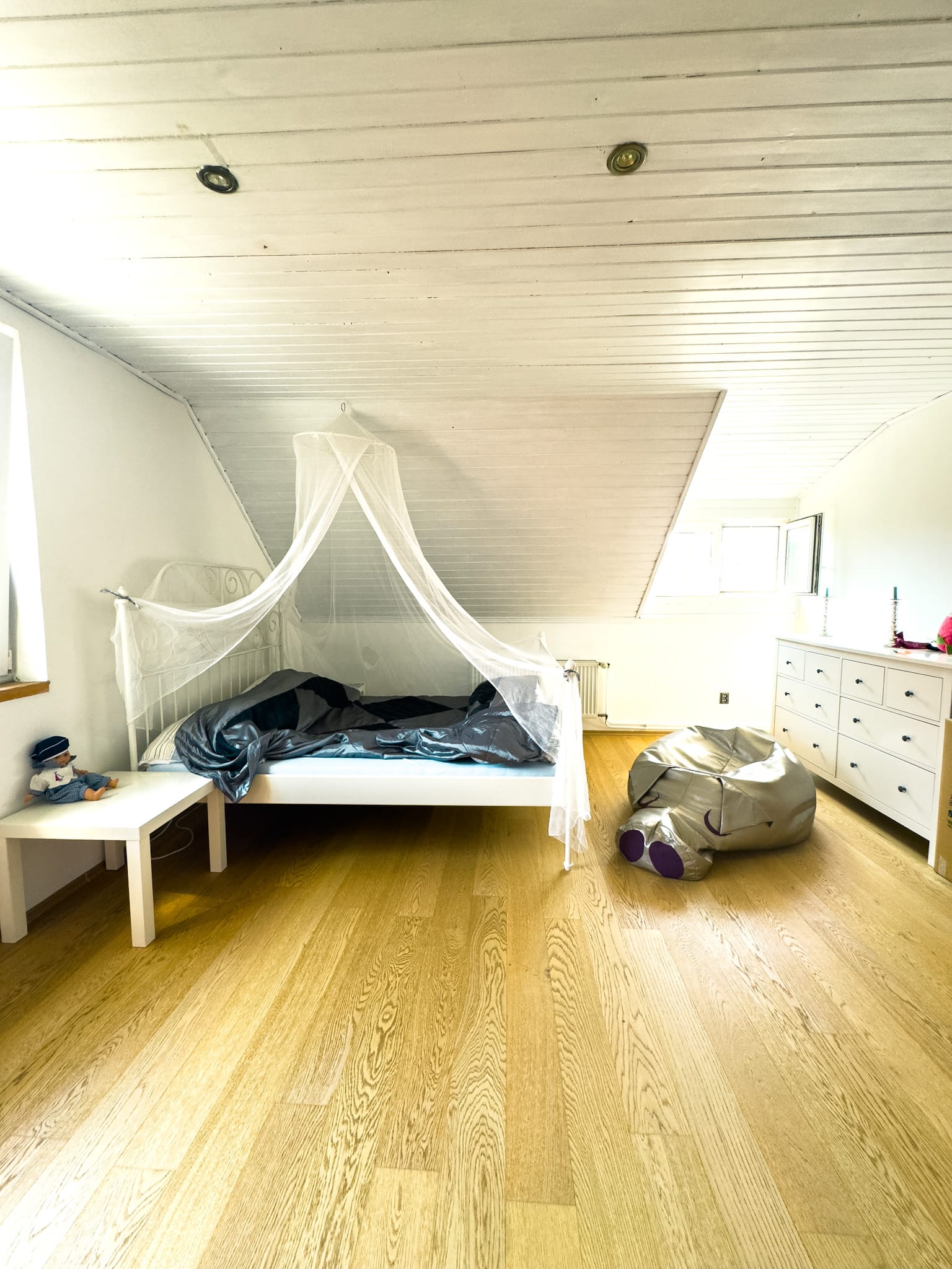 Poschodie ponúka dve veľké spálne a spoločenskú miestnosť s kuchynským kútom – skvelý priestor pre hostí alebo rodinné stretnutia. Na tomto podlaží sa nachádza aj druhá kúpeľňa (s rohovou vaňou) a východ na slnečnú loggiu, ktorá priestory krásne presvetľuje a dodáva im pocit vzdušnosti. Poschodie poskytuje dostatok pohodlia a súkromia aj pre početnejšiu rodinu či návštevy.