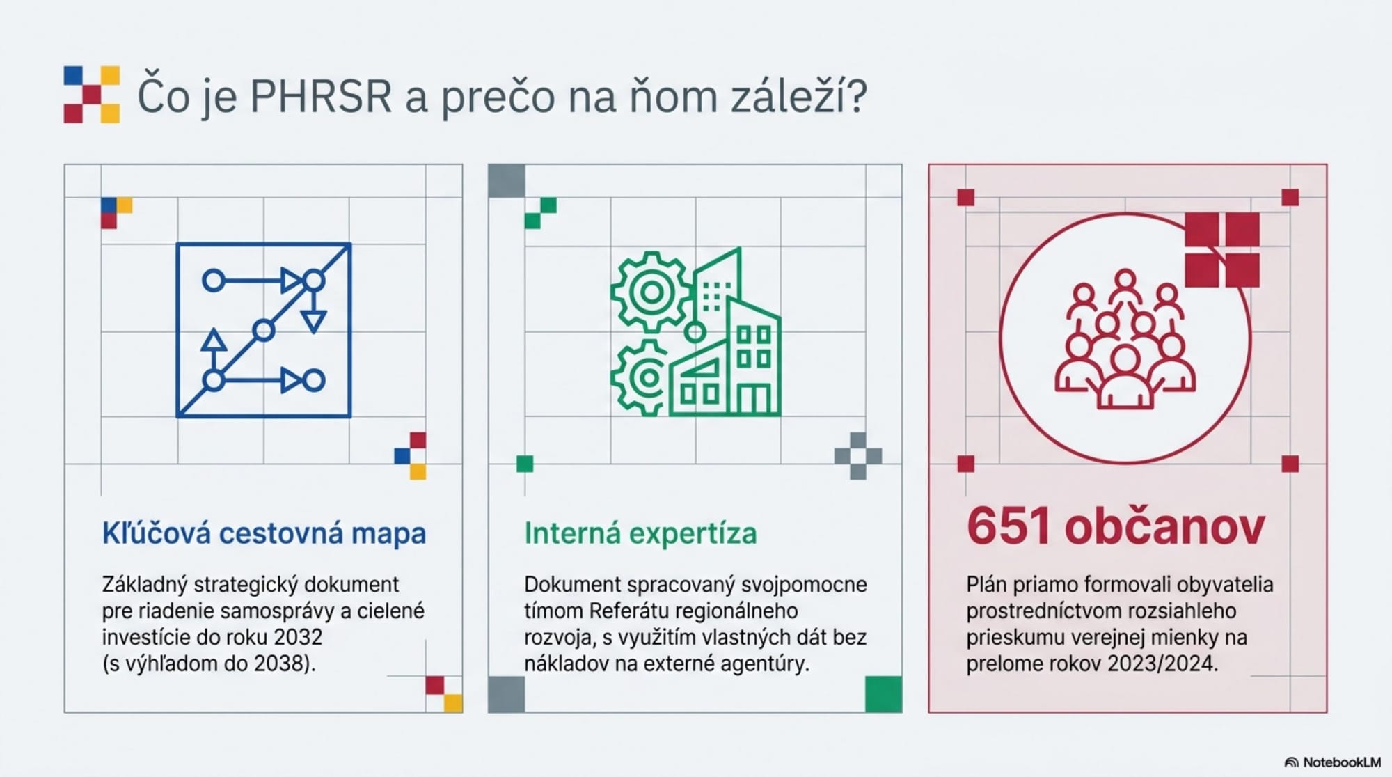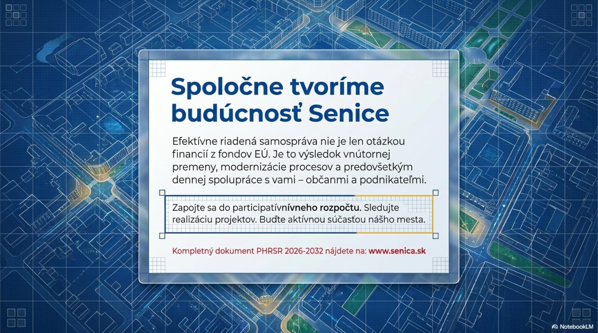 PHRSR je kľúčový strednodobý dokument, ktorý definuje smerovanie rozvoja mesta. Spolu s územným plánom tvorí základ pre riadenie samosprávy. Senica ho tentokrát spracovala svojpomocne – tímom Referátu regionálneho rozvoja – za účasti odborných pracovných skupín a verejnosti. Do dotazníkového prieskumu (2023/2024) sa zapojilo 651 respondentov.