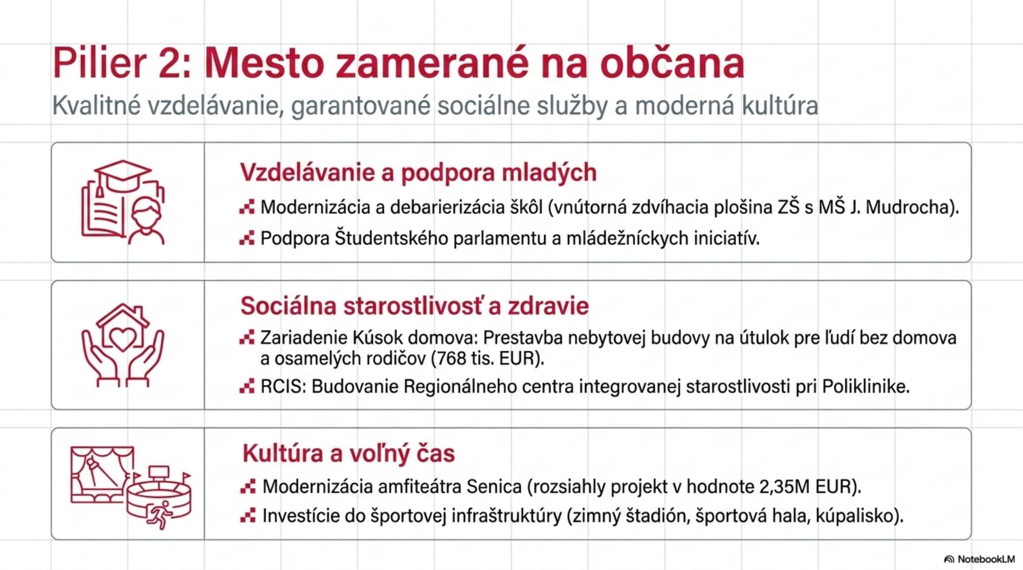 - Investície do zimného štadióna, športovej haly a kúpaliska