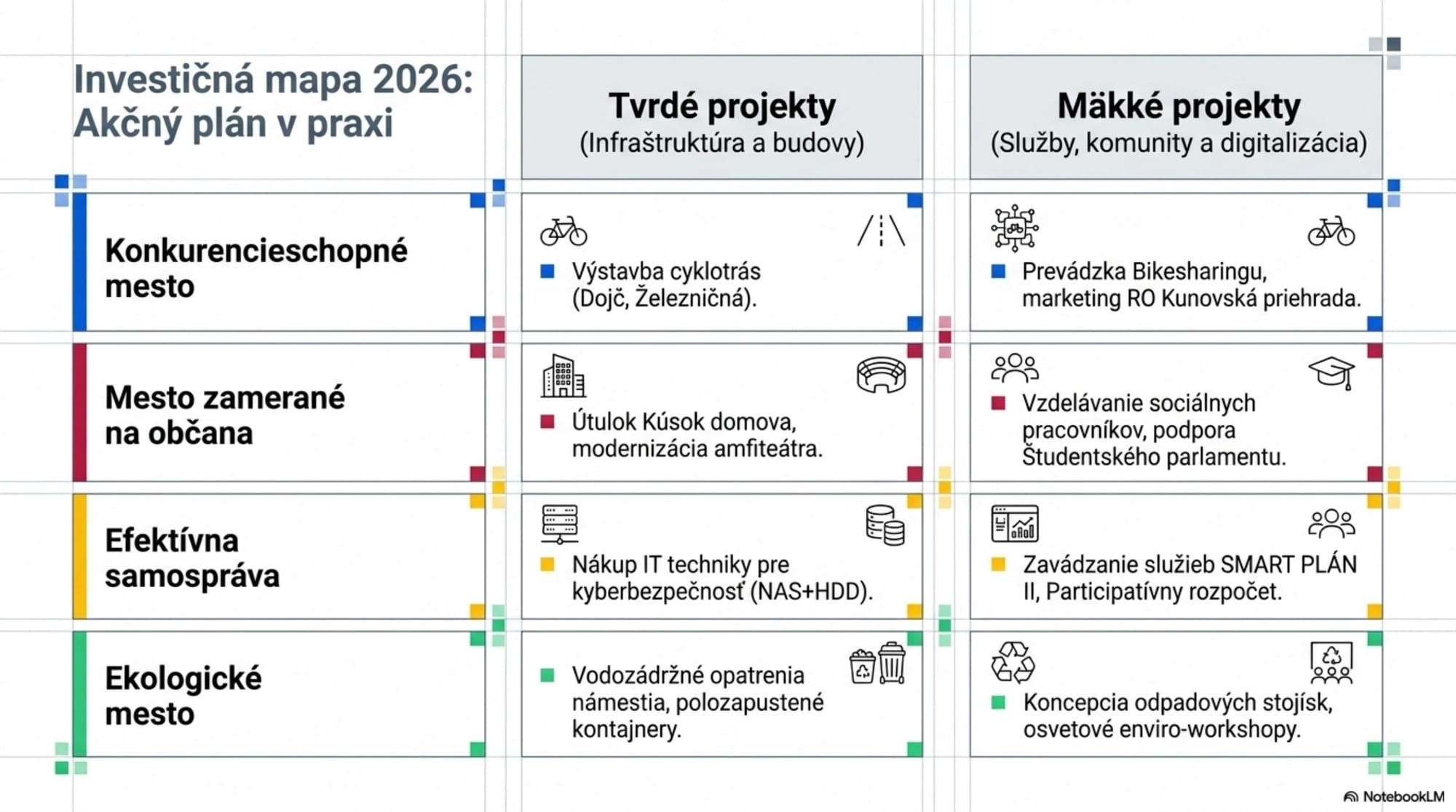 - Budovanie cyklotrás a bikesharingu, kampane pre nemotorovú dopravu